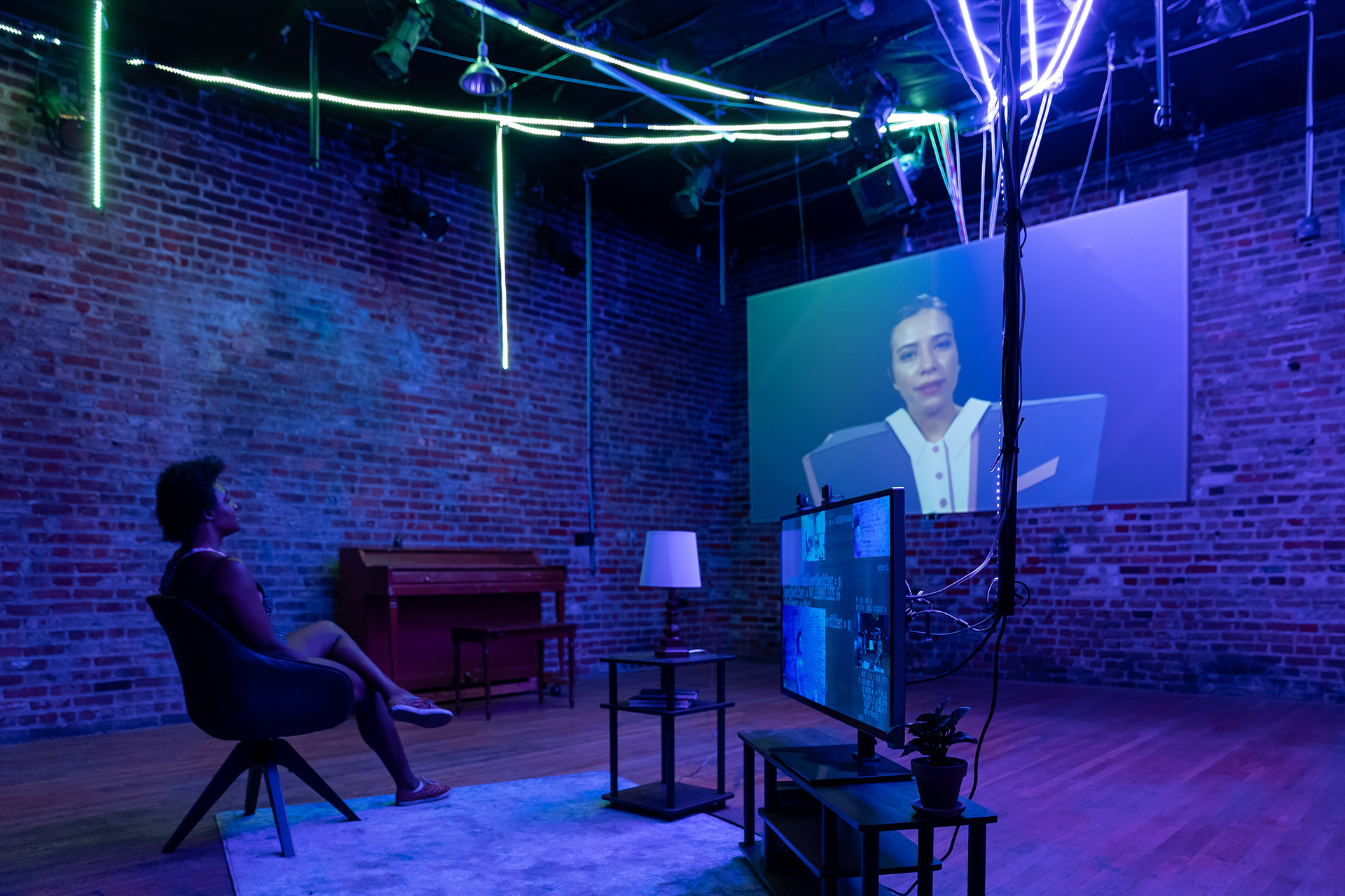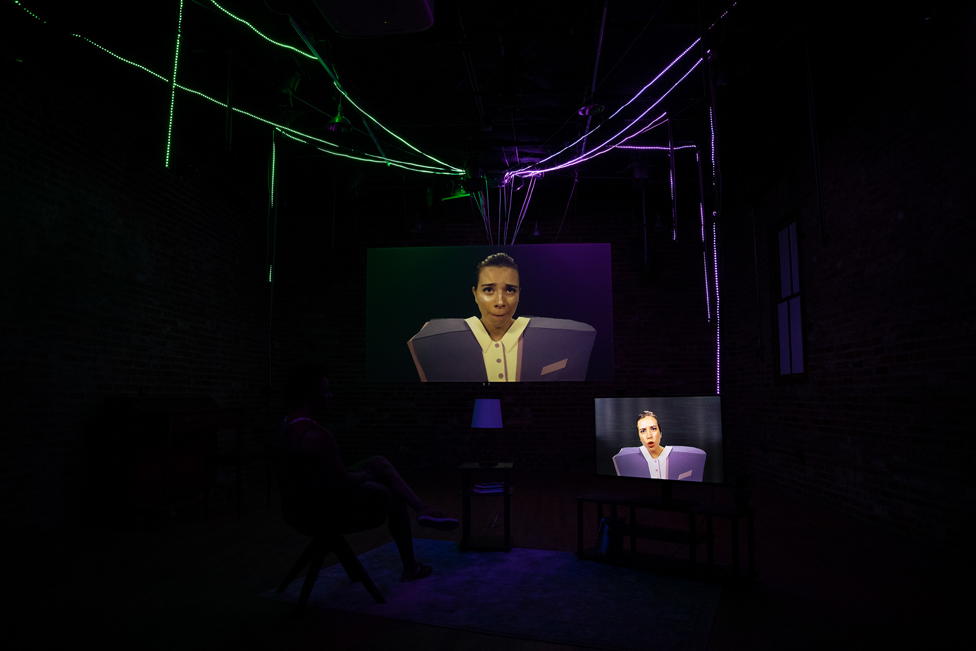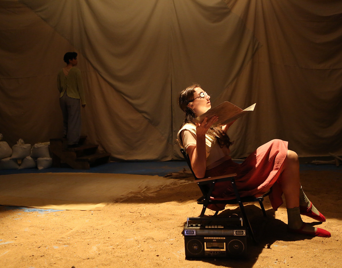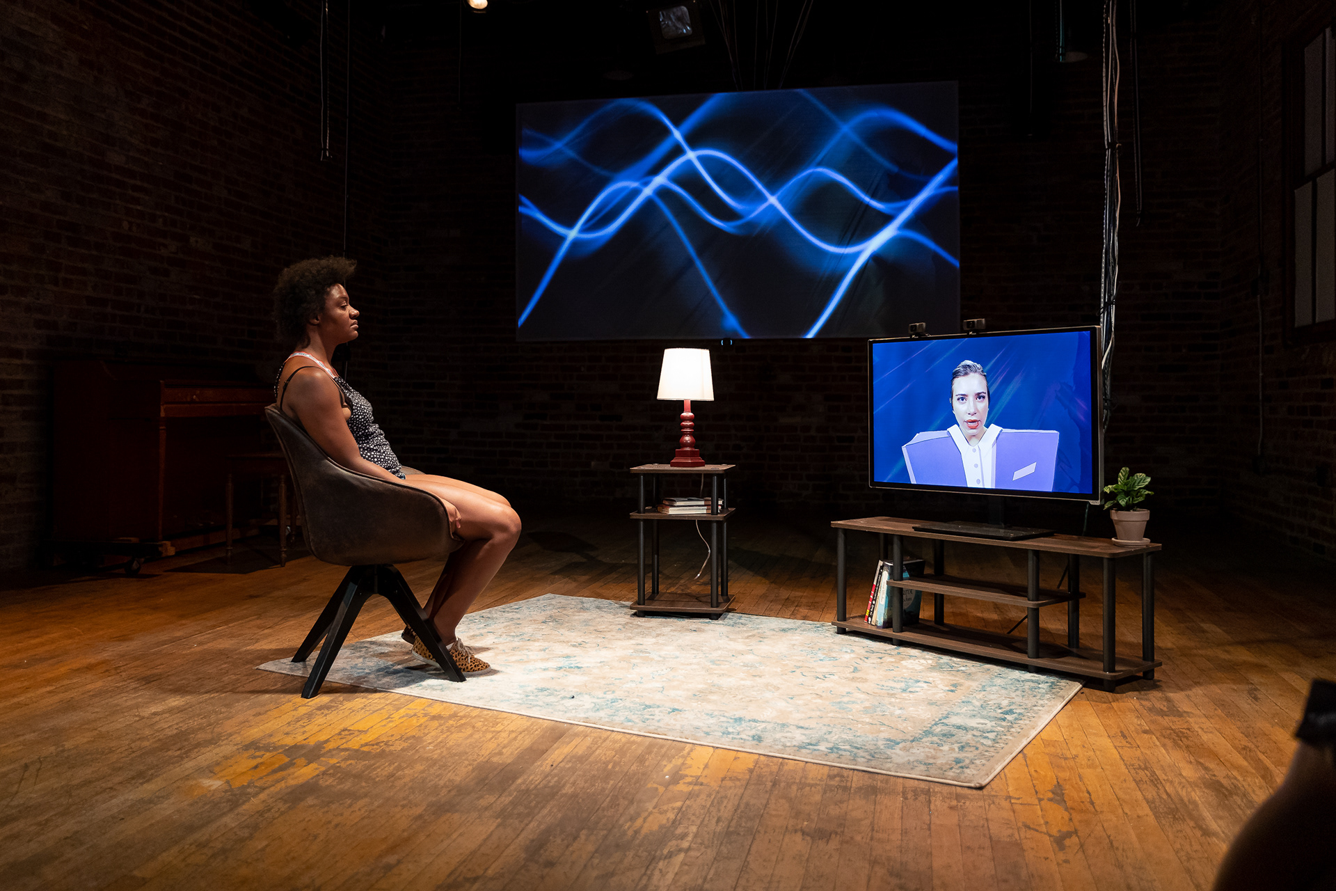 Summer 2021, Meta-Phys. Ed at the Brick Theater. Dir: Jesse Freedman; Performer: Sophie Zmorrod Laruelle; Video: Lacey Erb; Set: Kyu Shin; Costumes: Karen Boyer; Sound: Eamon Goodman; Stage Management: Lenyn Hernandez. Production Photography by Youn Jung Kim.
