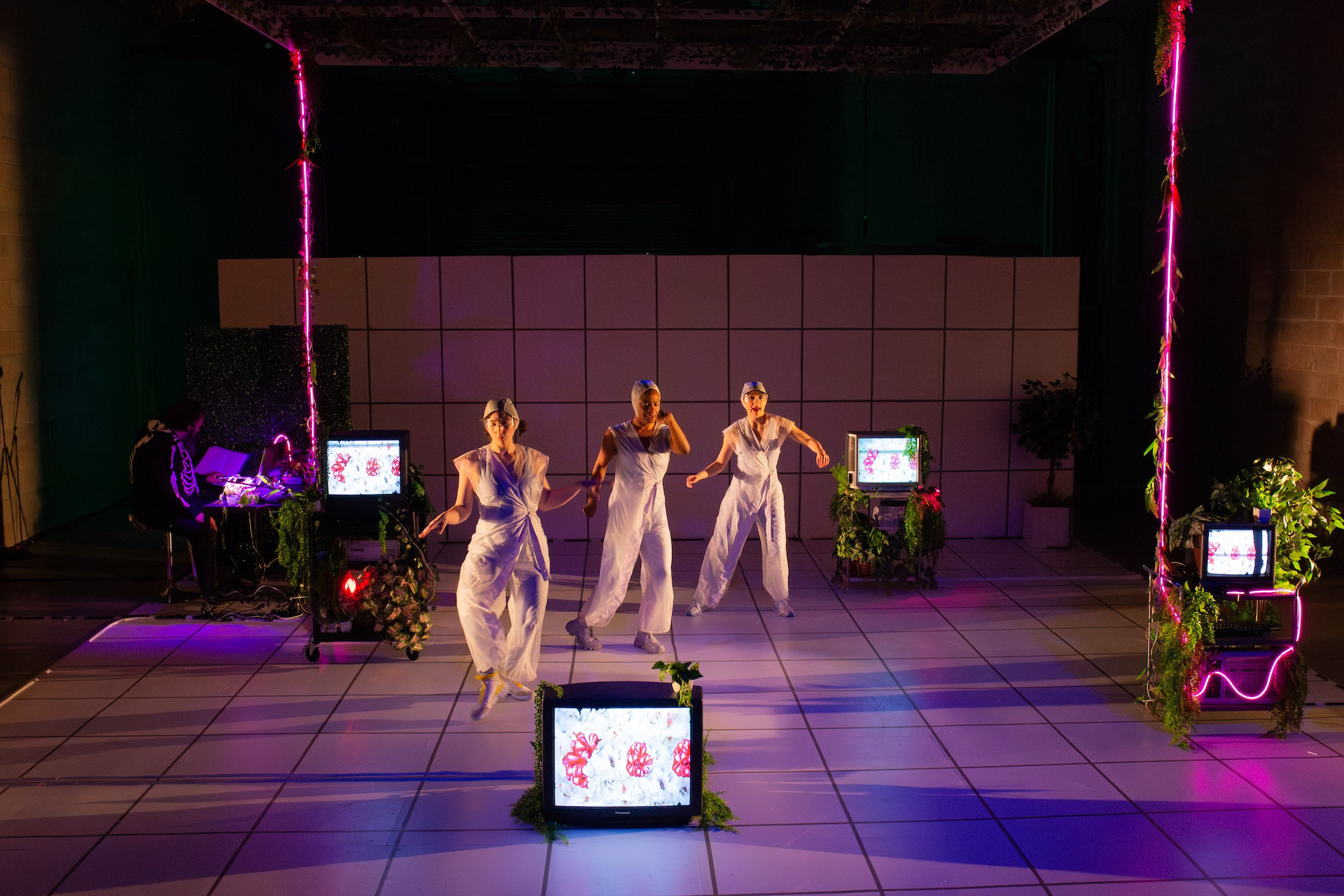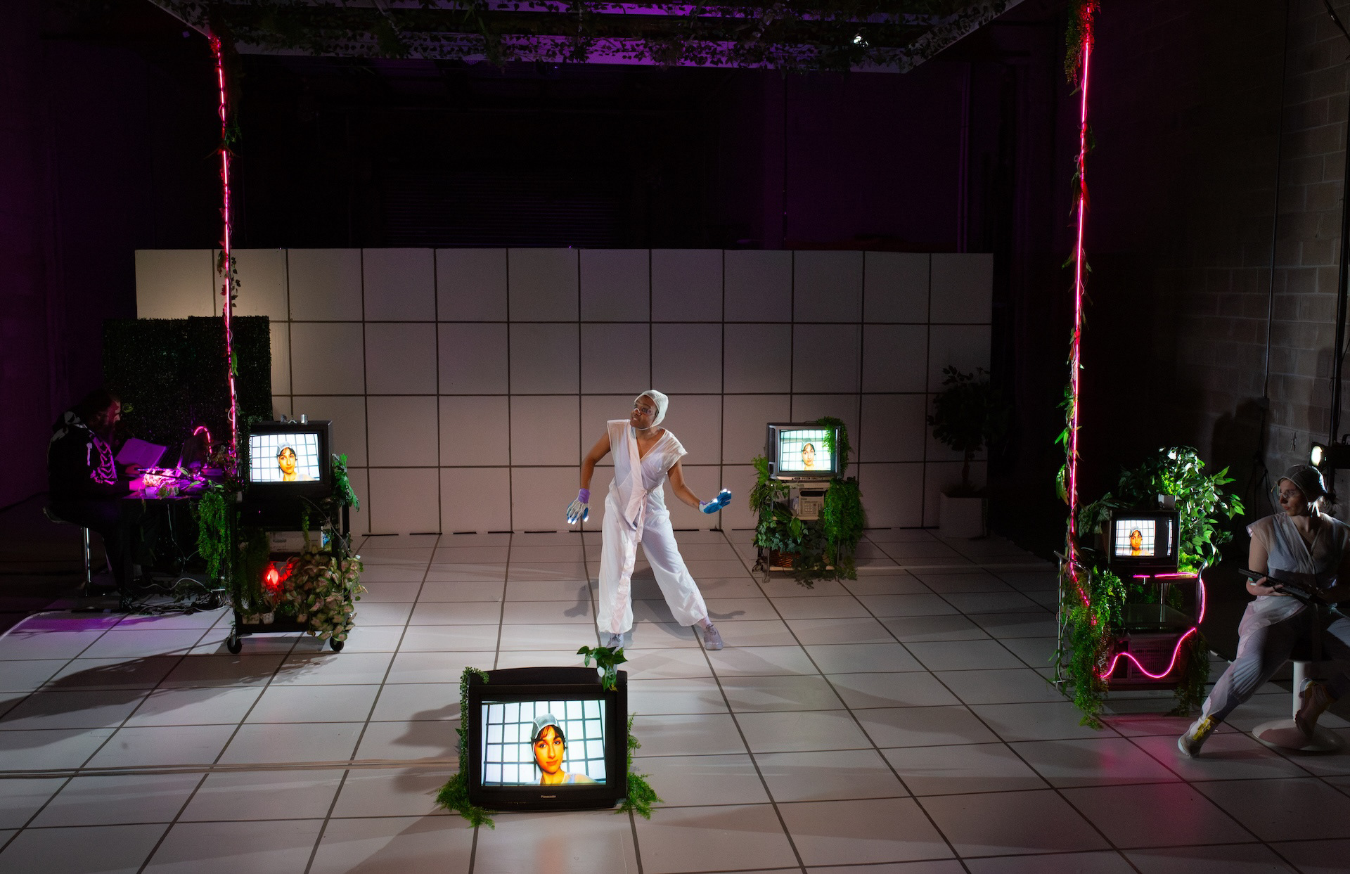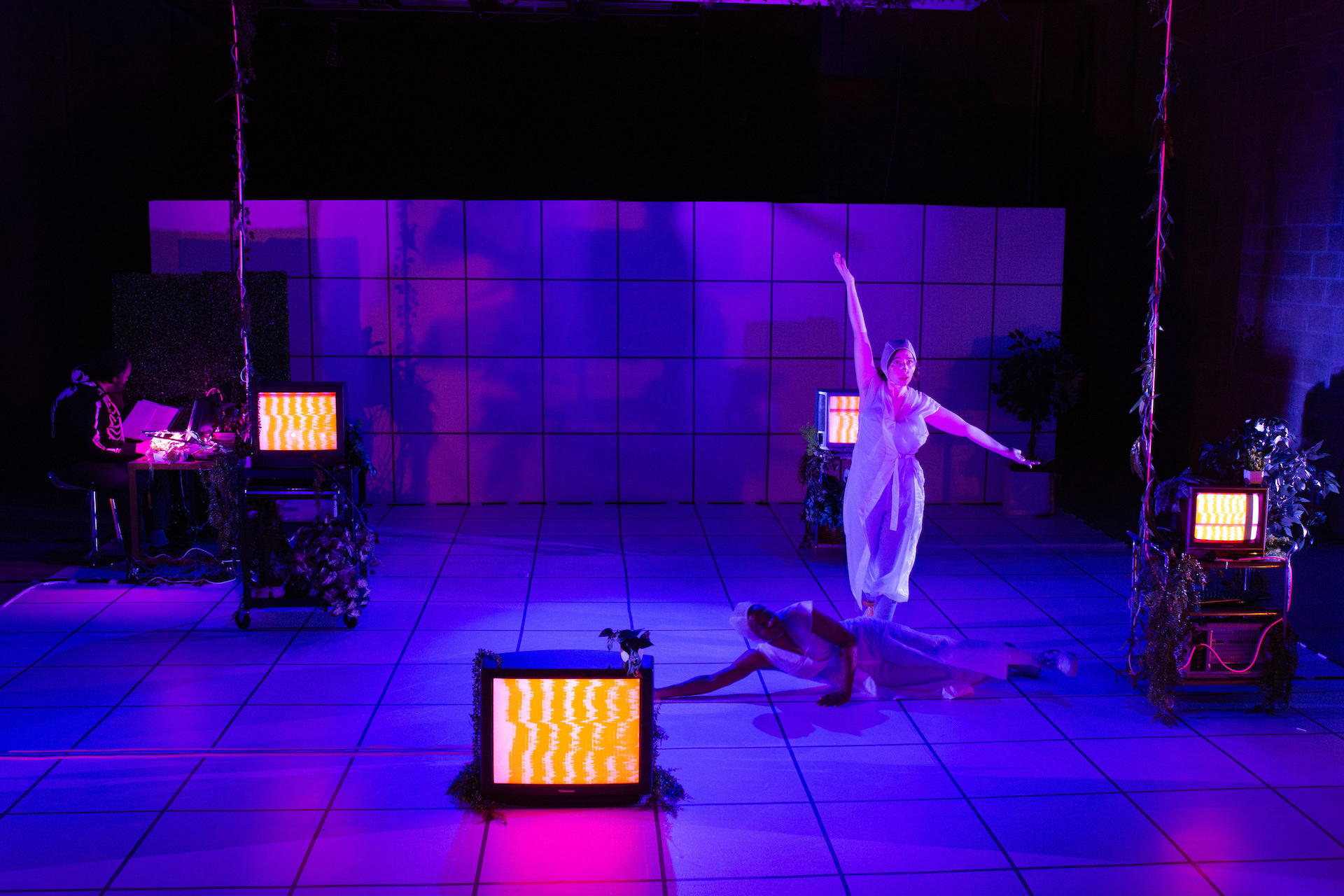 Spring 2025, Meta-Phys Ed. at Target Margin. Dir: Jesse Freedman; Scenic: Nora Marlow Smith; Costumes: Karen Boyer; Video: Jeremy Kadetsky; Sound and Composition: Eamon Goodman; Stage Management: Sam Kersnick. Production Photography by Raven Watson.
