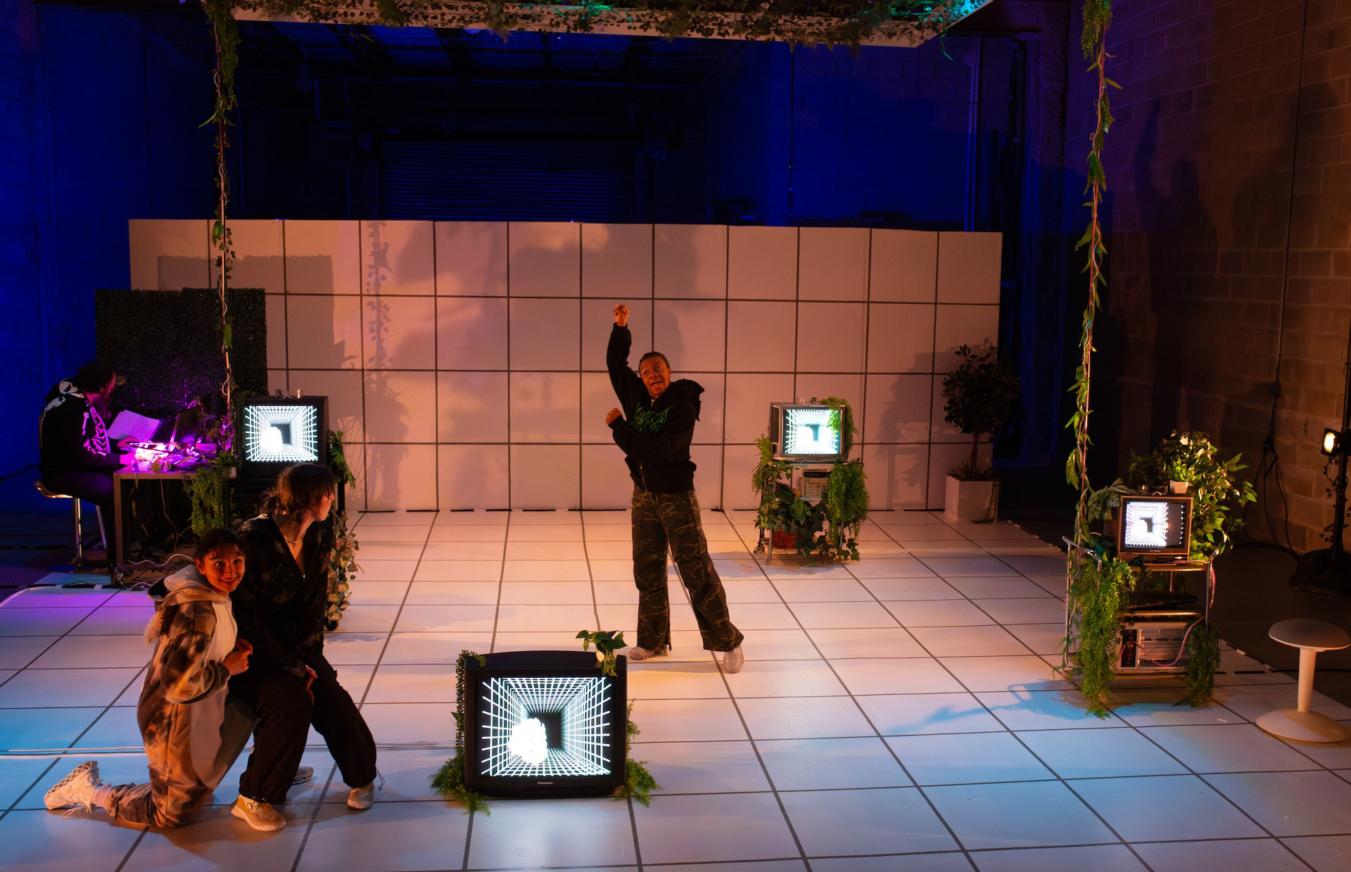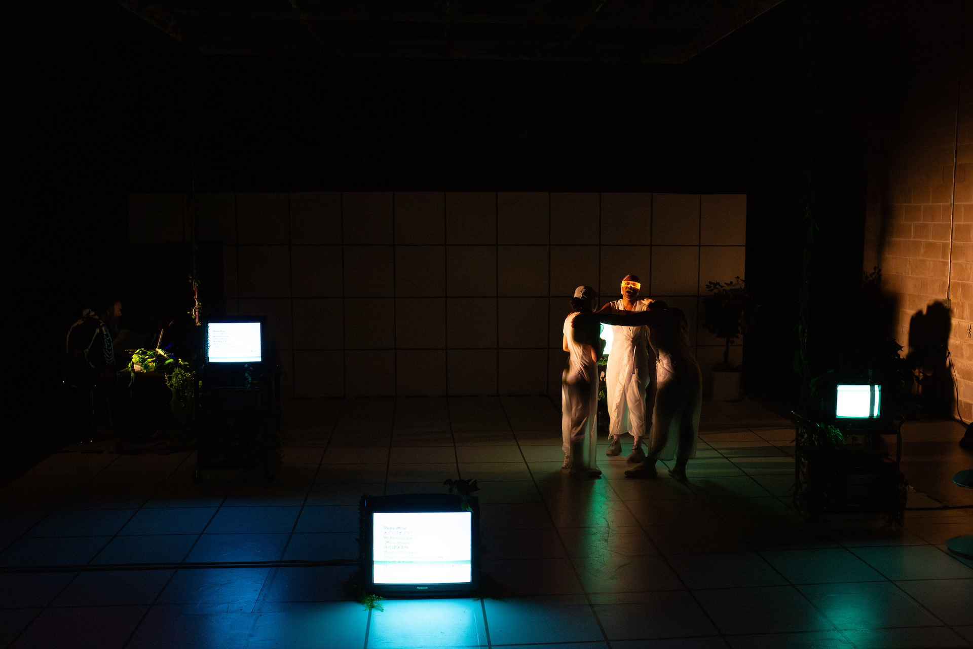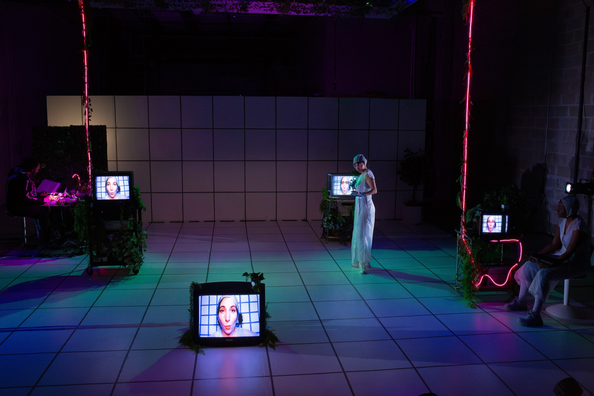 Spring 2025, Meta-Phys Ed. at Target Margin. Dir: Jesse Freedman; Scenic: Nora Marlow Smith; Costumes: Karen Boyer; Video: Jeremy Kadetsky; Sound and Composition: Eamon Goodman; Stage Management: Sam Kersnick. Production Photography by Raven Watson.